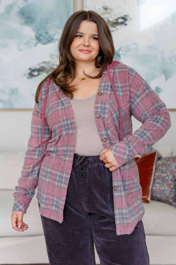 This Down in the Valley Hooded Shacket is the perfect mix of style and function. Crafted from brushed plaid hacci, this shacket has a hooded neckline, patch pocket, button front closure, and functional drawstring for a secure fit. Step into the season in style and comfort!