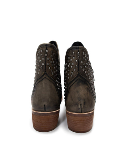 Stunning Black hued leather bootie with studded ankle and outside zipper.