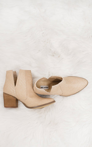 Our Tarim bootie has been a favorite time and time again! We now feature it in faux snakelike black upper with a blonde heel.