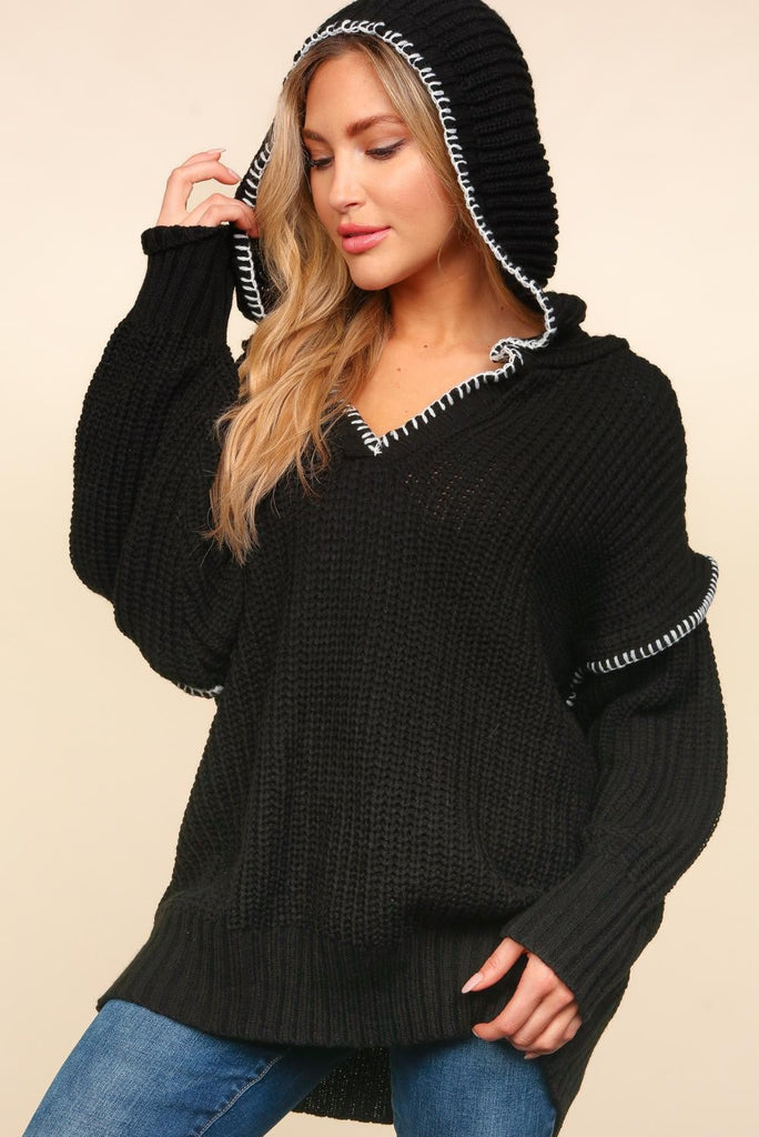NOTCHED NECK LONG SLEEVE LOOSE FIT OVERSIZED PULLOVER SOLID SWEATER KNIT TOP HOODIE AND STITCHES DETAIL100% Acrylic