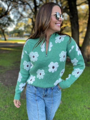 Keep the spring vibes strong all winter long in this soft and cozy half zip sweater featuring a drop shoulder, standing collar and floral design! Available in four colors!