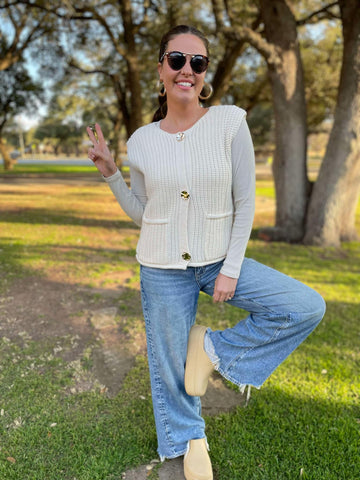 Add a chic layering piece to your closet with this textured knit sweater vest. Featuring functional buttons and pockets. Available in two classic colors!