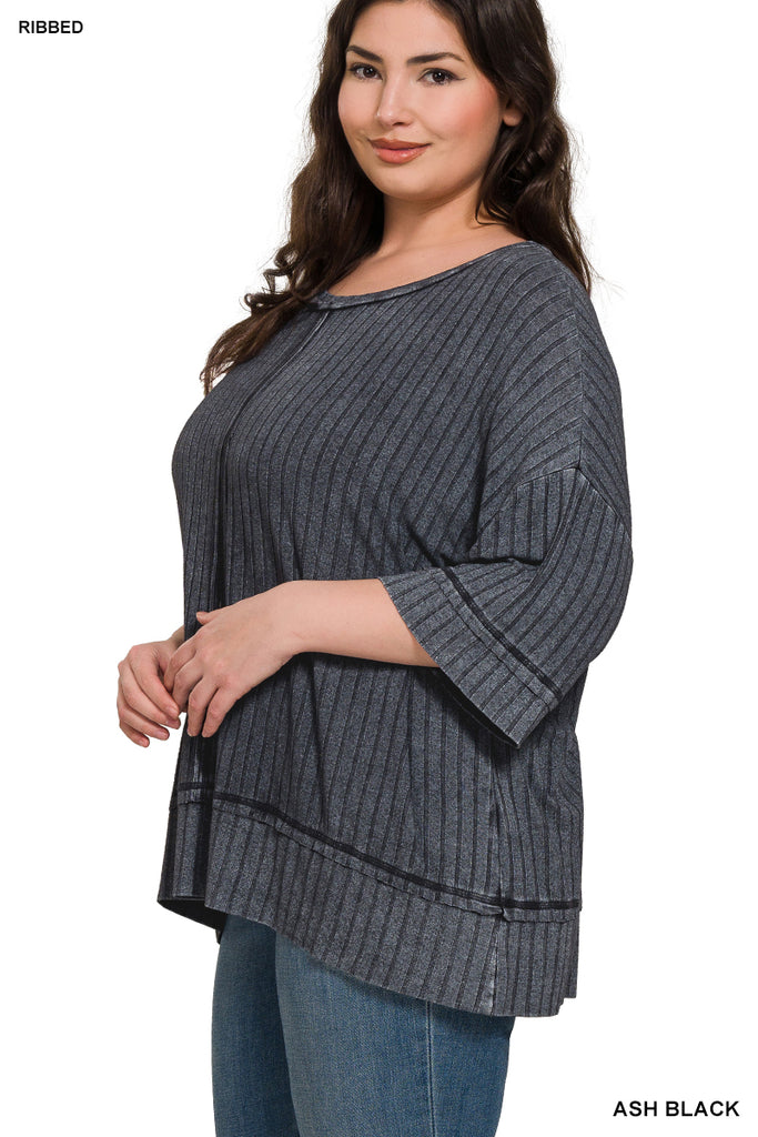 PLUS RIBBED DROP SHOULDER HALF SLEEVE BOAT-NECK TOP