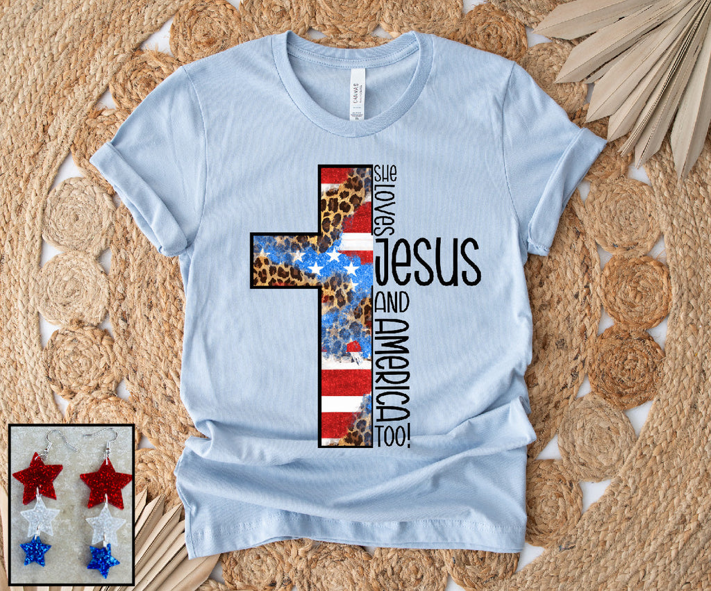 This tee pairs perfectly with our Acrylic Patriotic Star Earring!