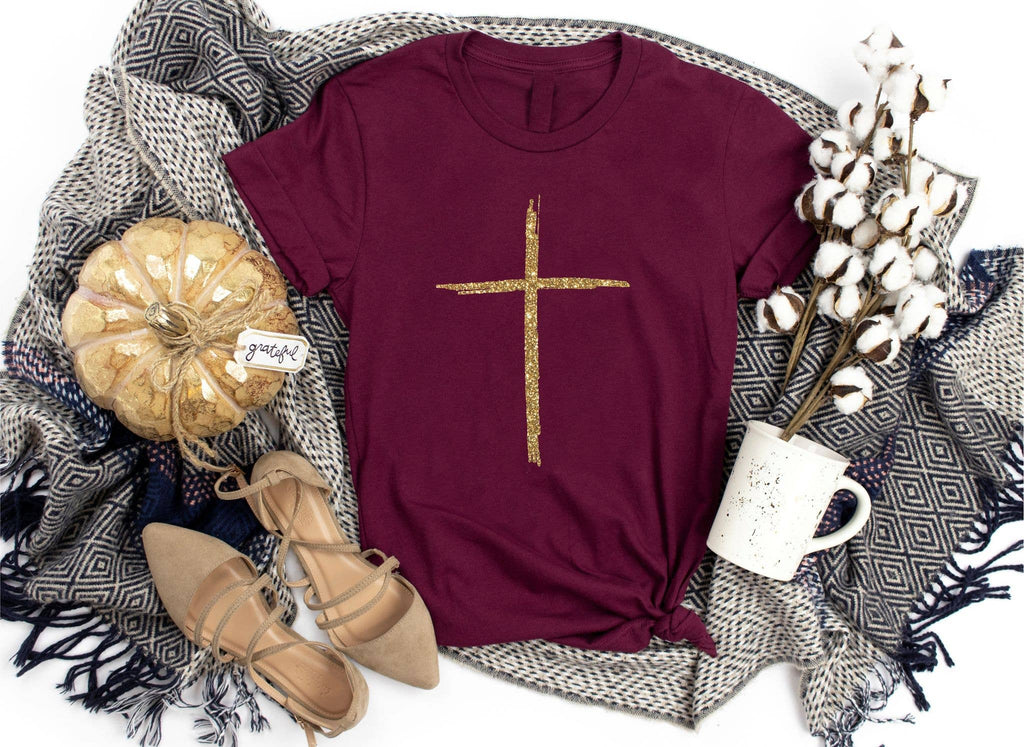 NEW FALL MAROON GOLD CROSS GRAPHIC TEE