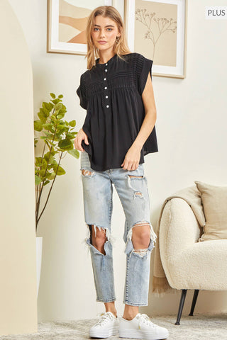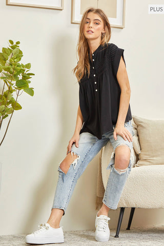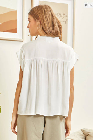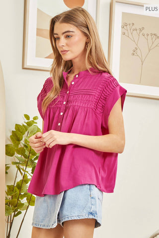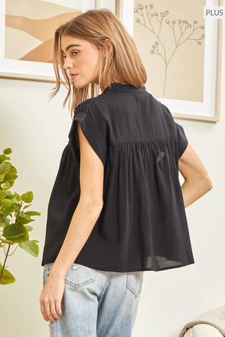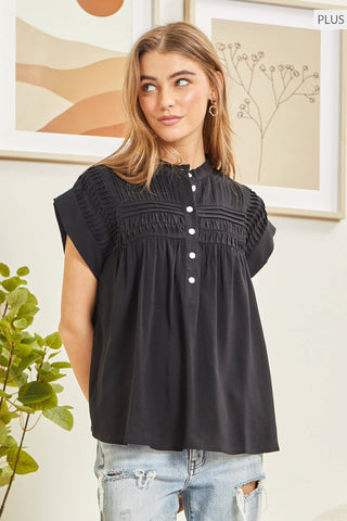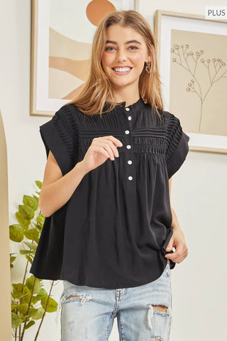 Easy solid top featuring a button down front, pleated detail and cap sleeves. Non sheer, relax fit.