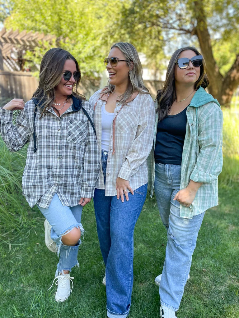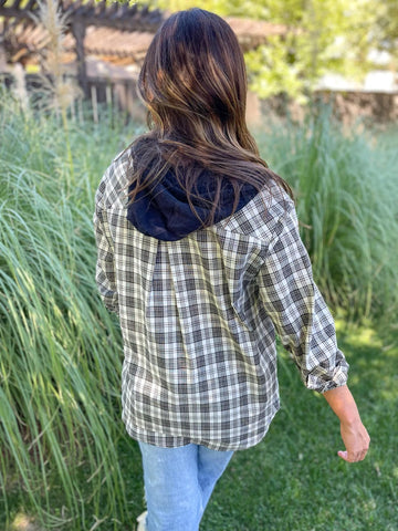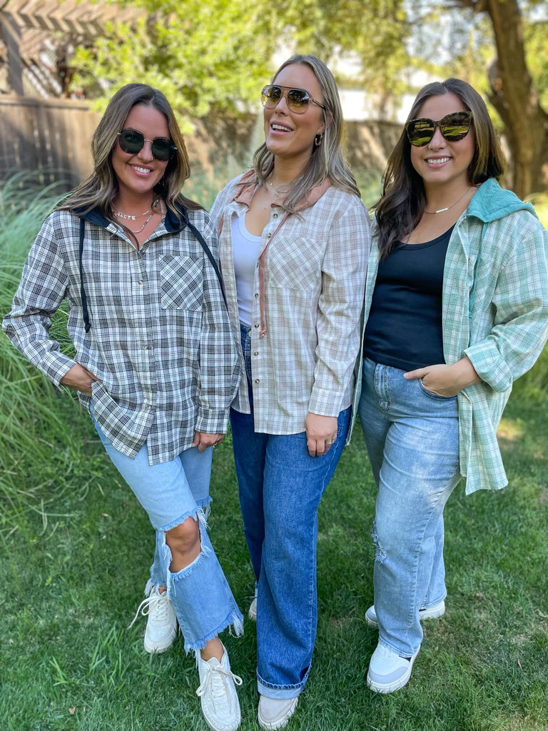 This lightweight hooded button-up is available in four shades of plaid with an accent hood detail. Featuring a chest pocket, functional buttons and hood with drawstring! Wear it buttoned or open as a versatile layering piece for all of your fall activities!