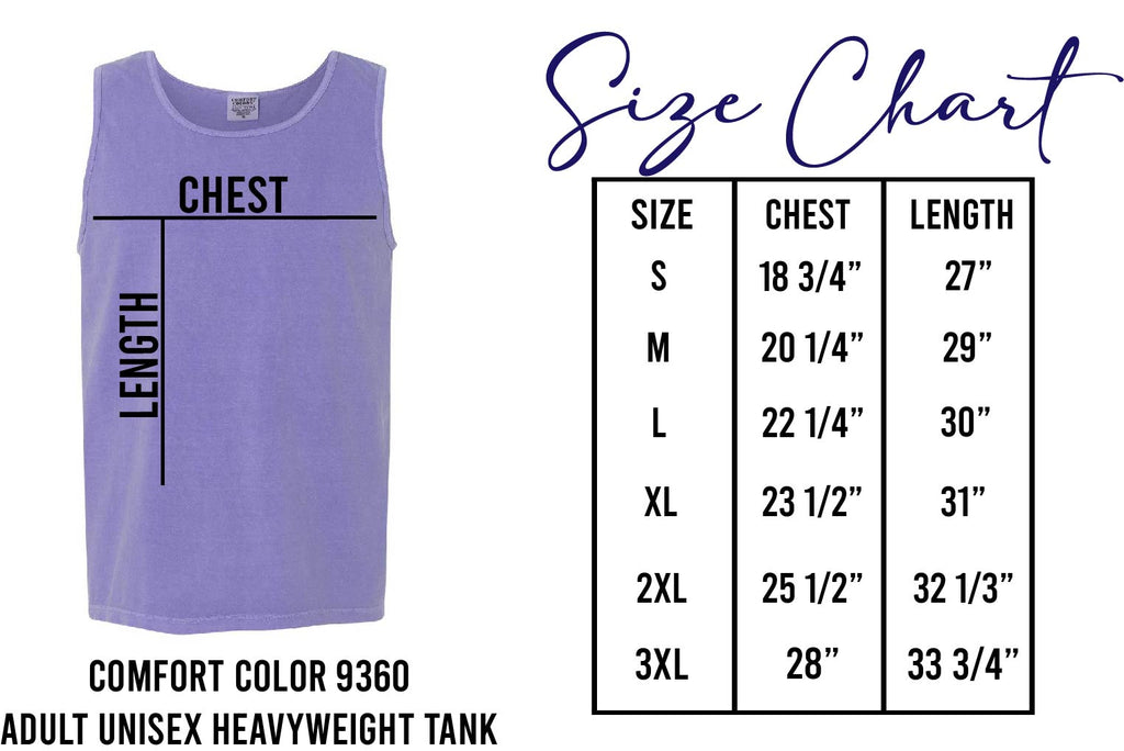 This design is direct to garment printed on a Violet tank (Comfort Color brand). Tanks are sleeveless with a rounded neckline & are true to size with a unisex fit. Made up of 100% Cotton.