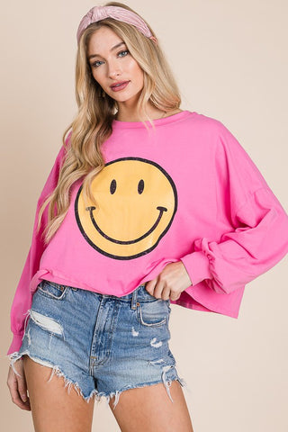 SMILEY FACE, LONG SLEEVE, CROP TOP-Smiley face print long sleeve t-shirt-Long sleeve-Crop topMODEL IS 5'9" AND IS WEARING SIZE SMALL