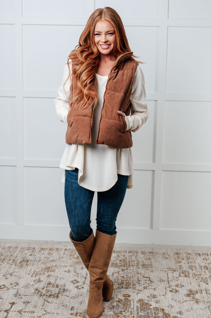 Get ready to elevate your style in our Set Me Up Corduroy Puffer Vest! Featuring a high collar, full zipper closure, and functional welt pockets, this vest is perfect for layering and adding a touch of sophistication to any outfit. Plus, the fully lined interior guarantees both warmth and comfort. Don't miss out on this trendy and practical addition to your wardrobe!