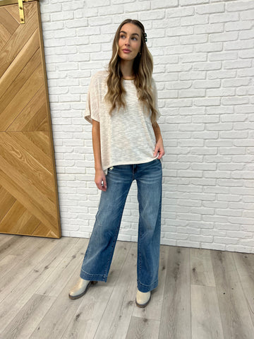 Unleash your flow with this playful and sheer Basically Flowing Dolman Sleeve Top in Sand Beige. The oversized fit and dolman sleeves add a touch of whimsy, while the round neckline and front patch pocket add versatile functionality. Made with Hacci material for ultimate comfort!
