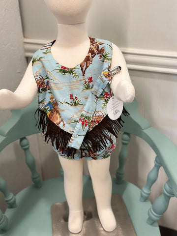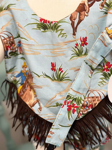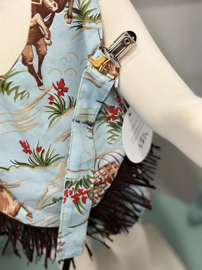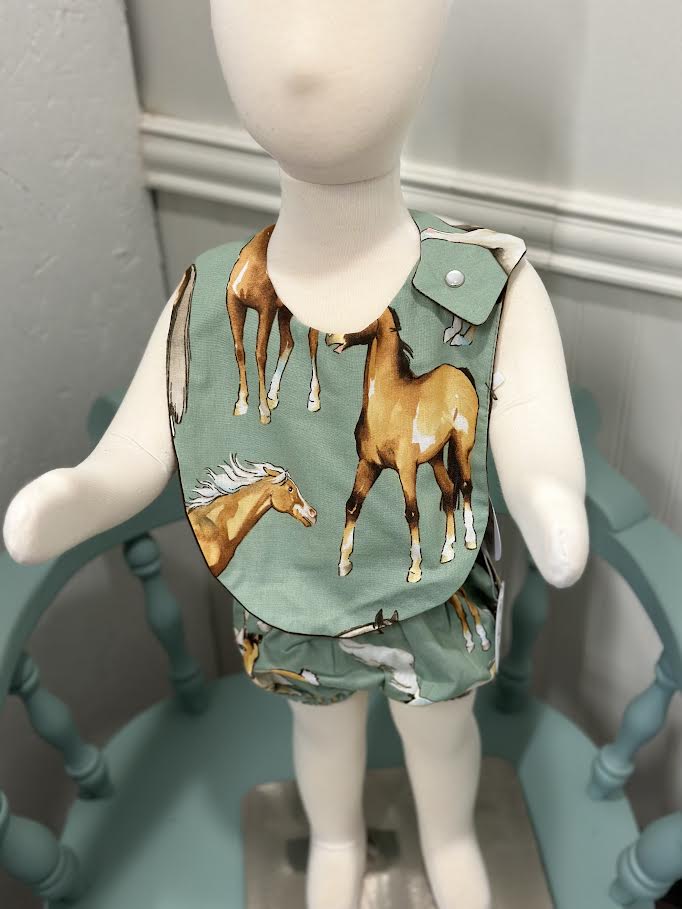 Our Cowboy bib sets make the perfect gift! Made of 100% cotton fabric with fleece backing. Features snap closure and a metal pacifier clip.