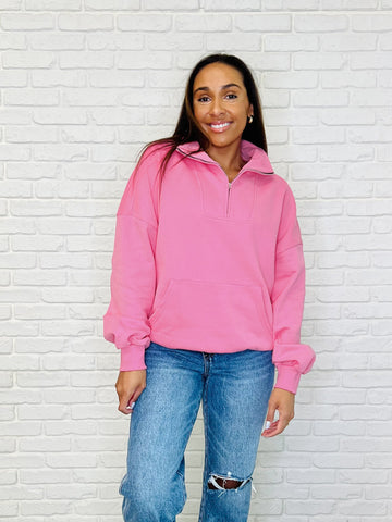 Get cozy with the Bonbon Delight Half Zip Pullover! Made with soft fleece and a high neckline, this pullover is perfect for chilly days. The half zipper closure features silver hardware, while the drop shoulder and kangaroo pocket add a unique touch. Finished with banded, ribbed sleeve cuff and hem.