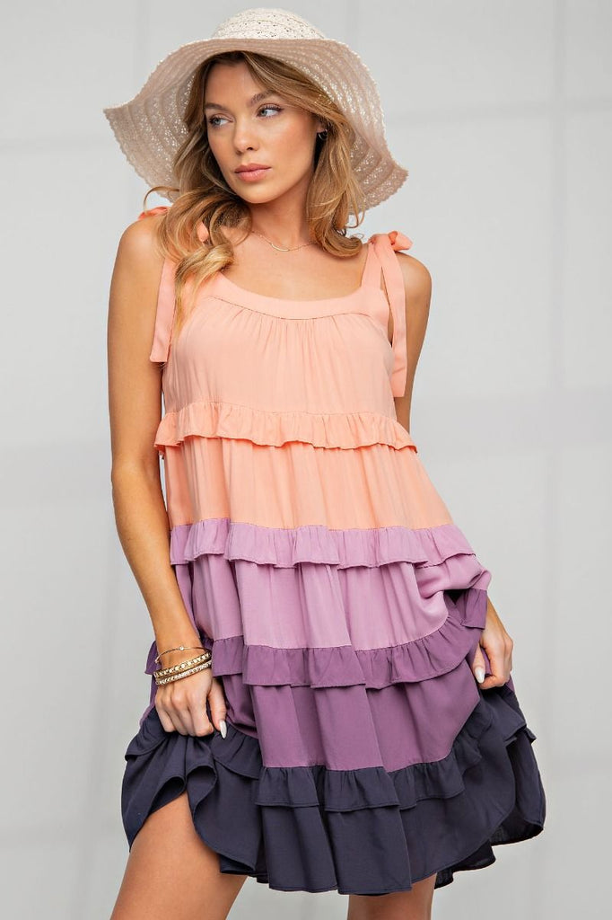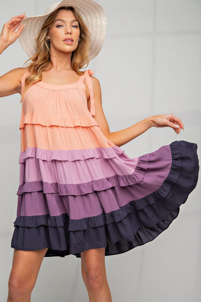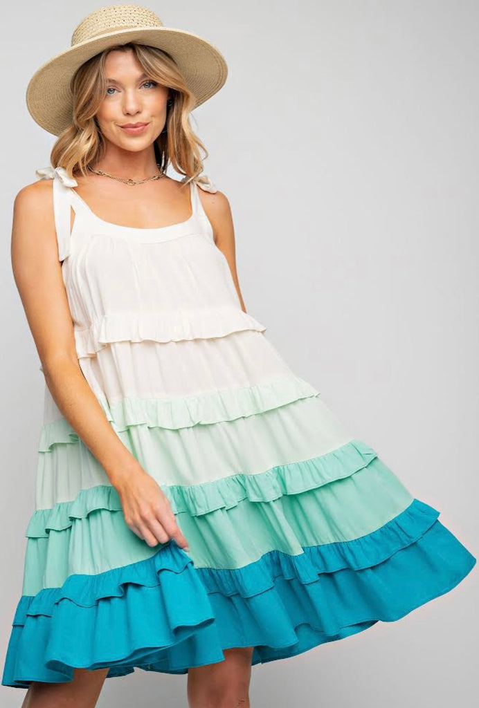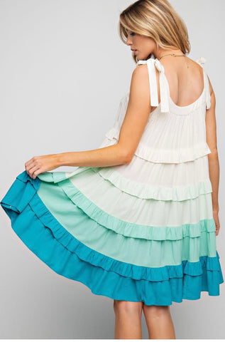 -SCOOP NECKLINE-ADJUSTABLE SHOULDER STRAPS-RUCHED AND PLEATED DETAILING-TIERED RUFFLE LAYERS-A LINE SILHOUETTE-FLOWY AND SWINGY