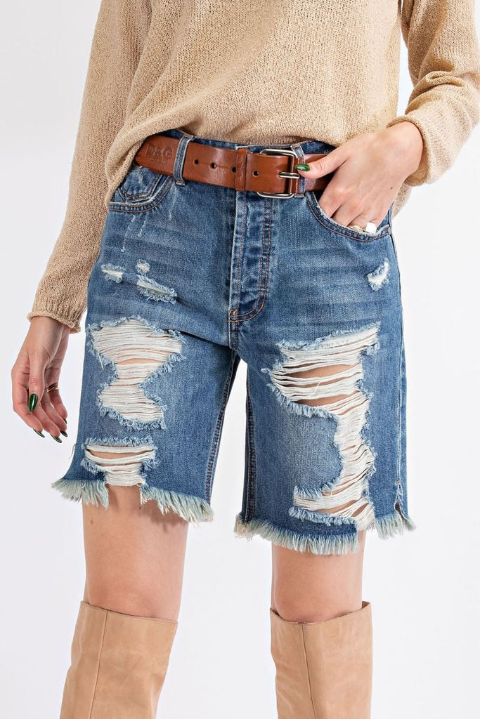 Description: EFFORTLESSLY ESSENTIAL, THESE SO COOL CUTOFFS DISTRESSED WASHED DENIM SHORTS-FEATURED HIGH RISE-LONGLINE SILHOUETTE-EXAGGERATED DISTRESSING-PERFECT FOR LIVED IN LOOK-BUTTON DOWN CLOSURE-FIVE POCKET STYLE-MODEL HEIGHT 5'10