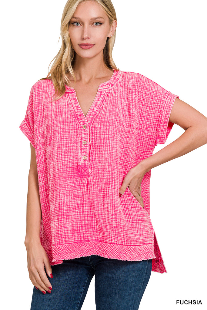 WASHED DOUBLE GAUZE 3/4 BUTTON HENLEY NECK SHORT SLEEVE SHIRT