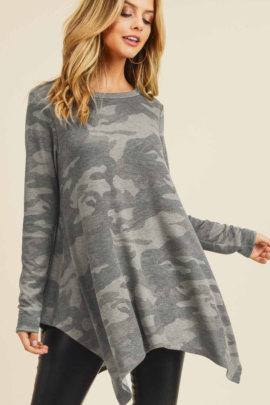 CAMO TUNIC TOP WITH A ROUND NECKLINE, LONG SLEEVES, AND SHARK BITE HEM