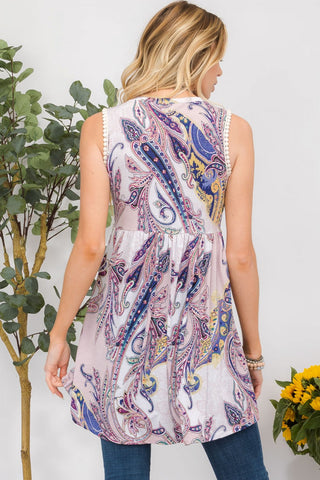 Paisley Print High Low Sleeveless Top with Lace Trim |