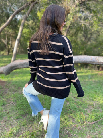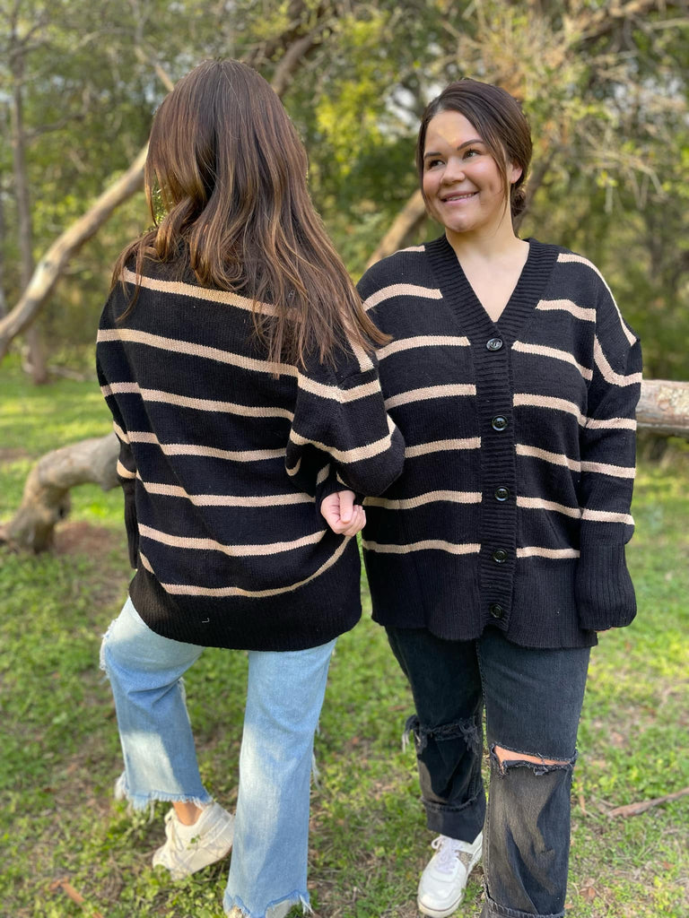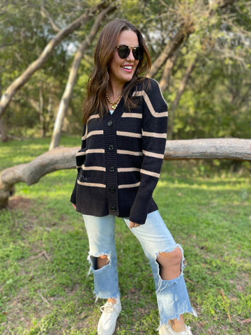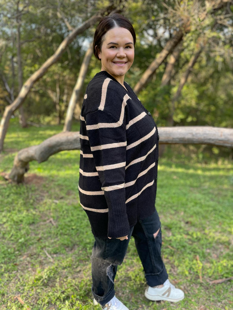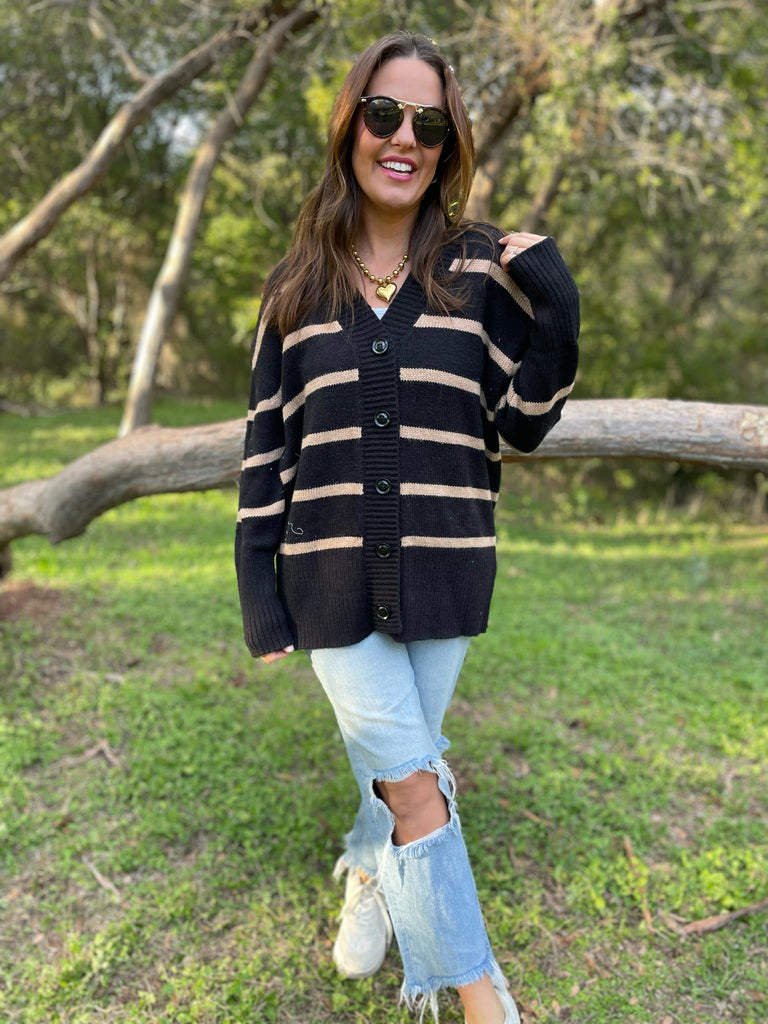 A classic layering piece! This beautiful knit striped cardigan features a relaxed fit, drop shoulder and functional buttons.