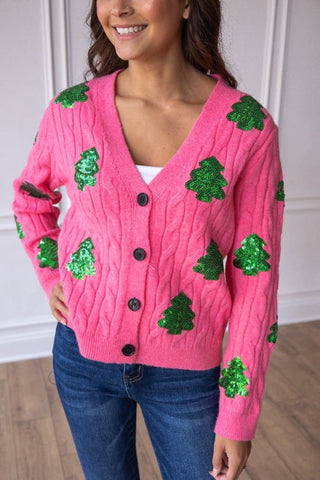 The classic cardigan silhouette, paired with the playful sequin trees, creates a perfect balance between sophistication and festivity. Whether you're attending a holiday party, decorating the tree, or simply enjoying cozy moments at home, this cardigan is the ideal choice for embracing the holiday spirit in style.