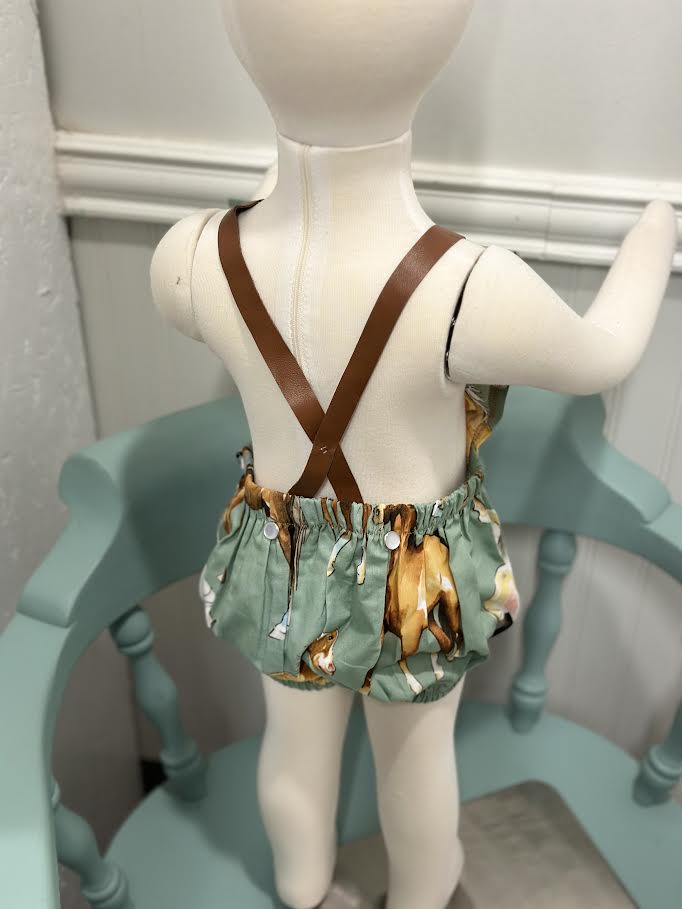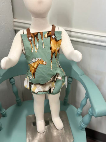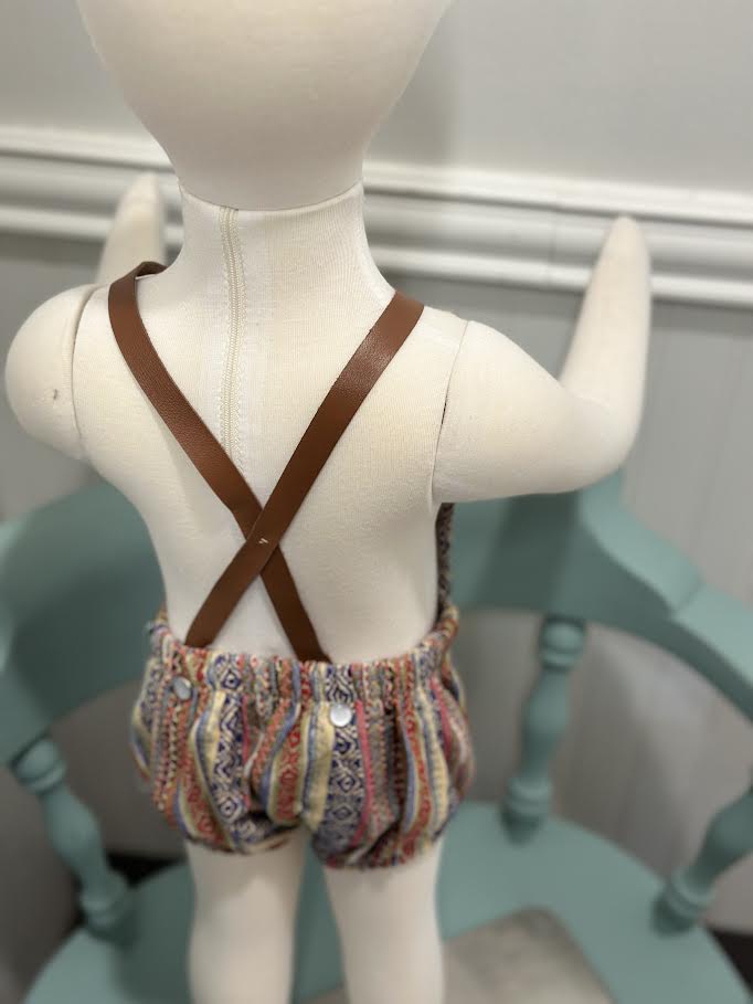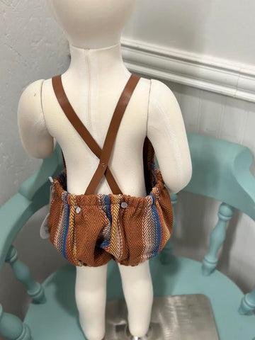 Comfortable and cute serape baby romper! Made 100% cotton. Features leather straps, snap button closures for an easy diaper change, and strap snaps for easy washing removal. Woven Hearing bone twill stripe. NOTE: Due to the natural nature of our leather straps, there will a variation in color. Each romper will have its own unique look due to the large stripe pattern, some colors will show more than others. SIZES 3-6 Months 6-12 Months 12-24 Months MATERIALS Woven Cotton Sarape Leather Straps Snap Closure