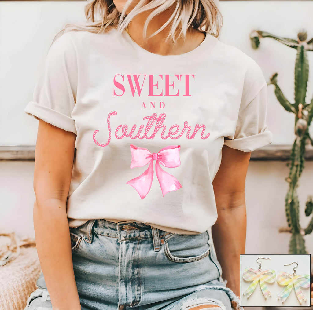 This tee pairs perfectly with our Pastel Plaid Coquette Bow Earring!