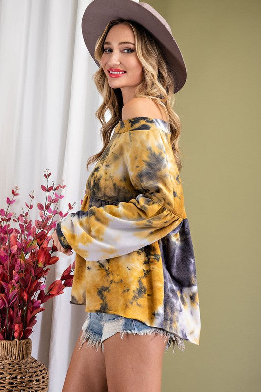 A tie dye long sleeve top with slight puff sleeves made in a babydoll silhouette. Model is 5'8" and wearing a size small78%POLYESTER/28%RAYON/4%SPANDEX