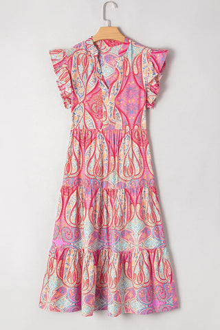 Tribal Paisley Print Ruffled Sleeve Notch Neck Midi Dress