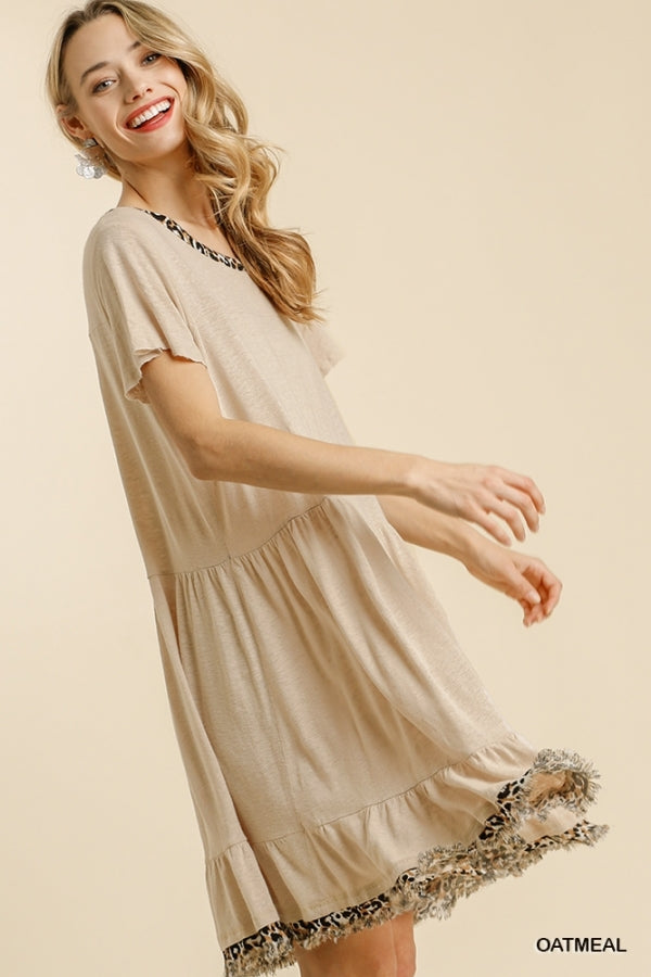 Linen Blend Animal Printed Trimmed Raw Short Sleeve Dress with Frayed Hem & No Lining
